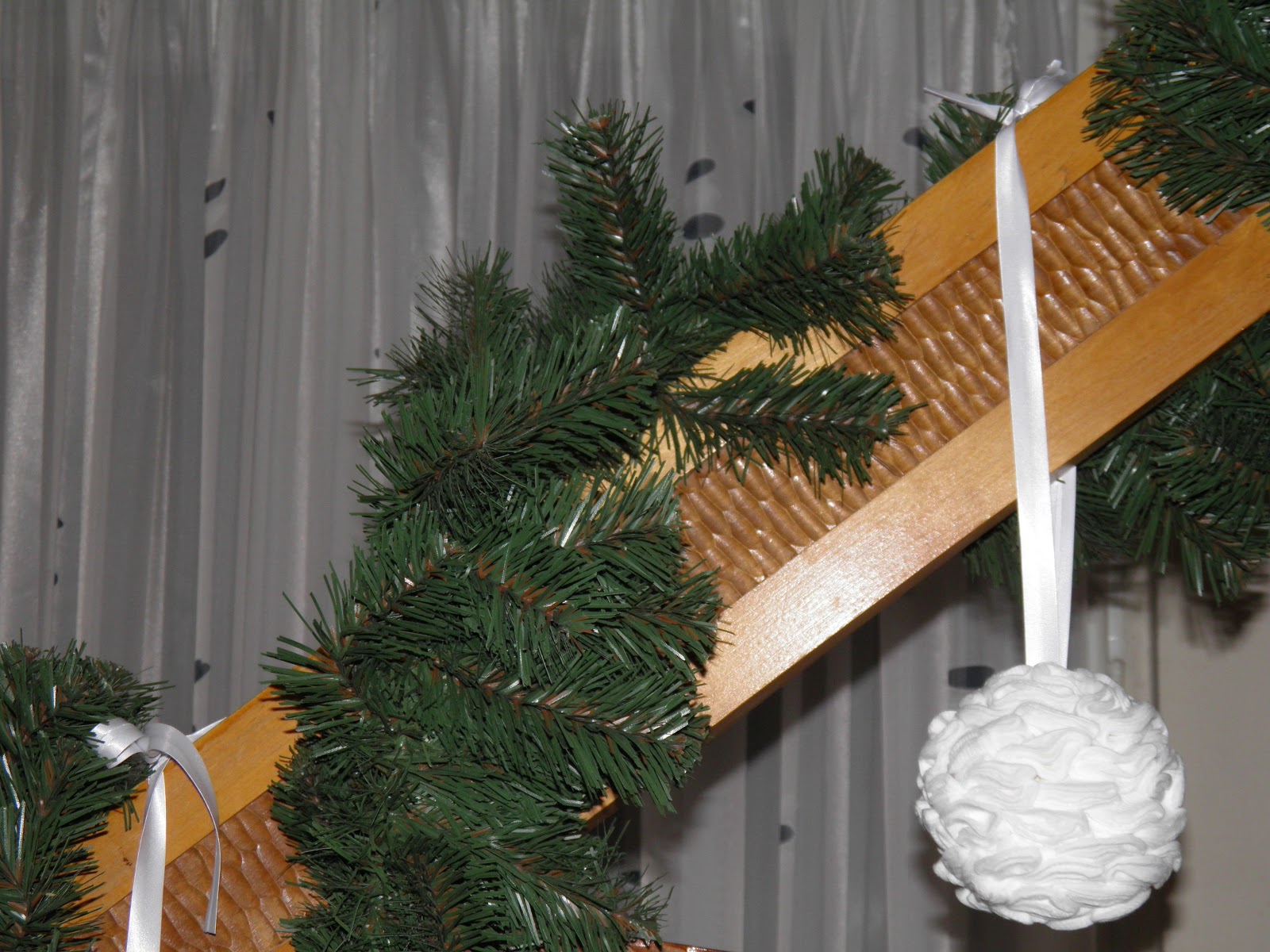 W domu pojawiają się powoli pierwsze dekoracje, poręcz schodów okręciłam girlandą świerkową i powiesiłam styropianowe bombki z płatkami